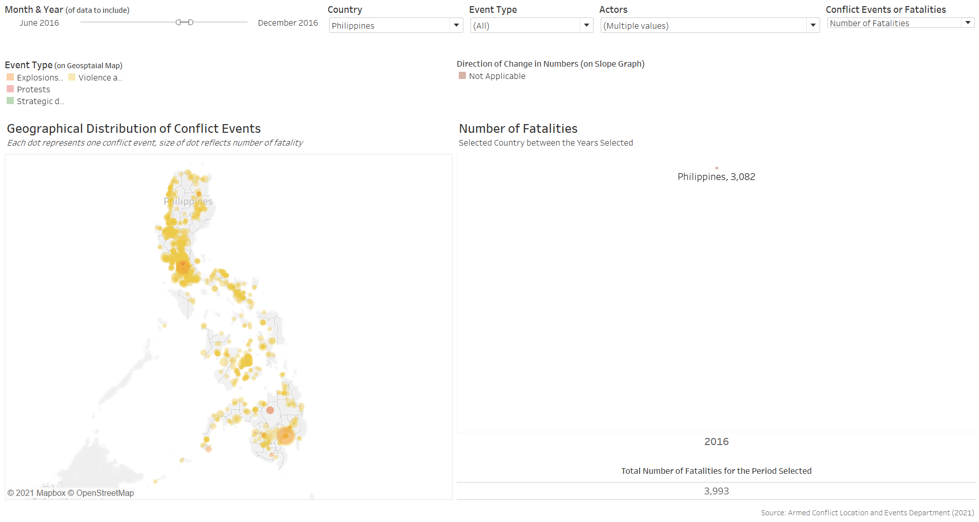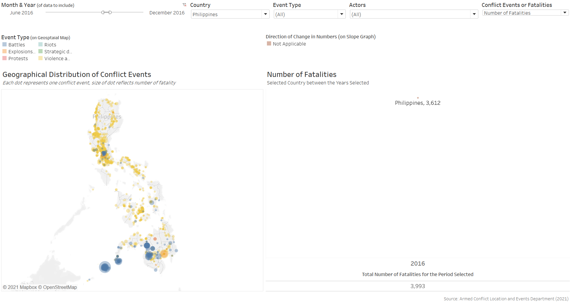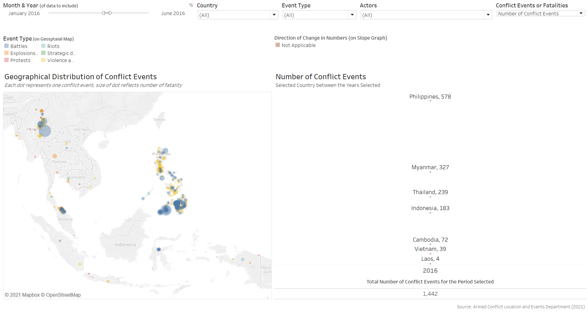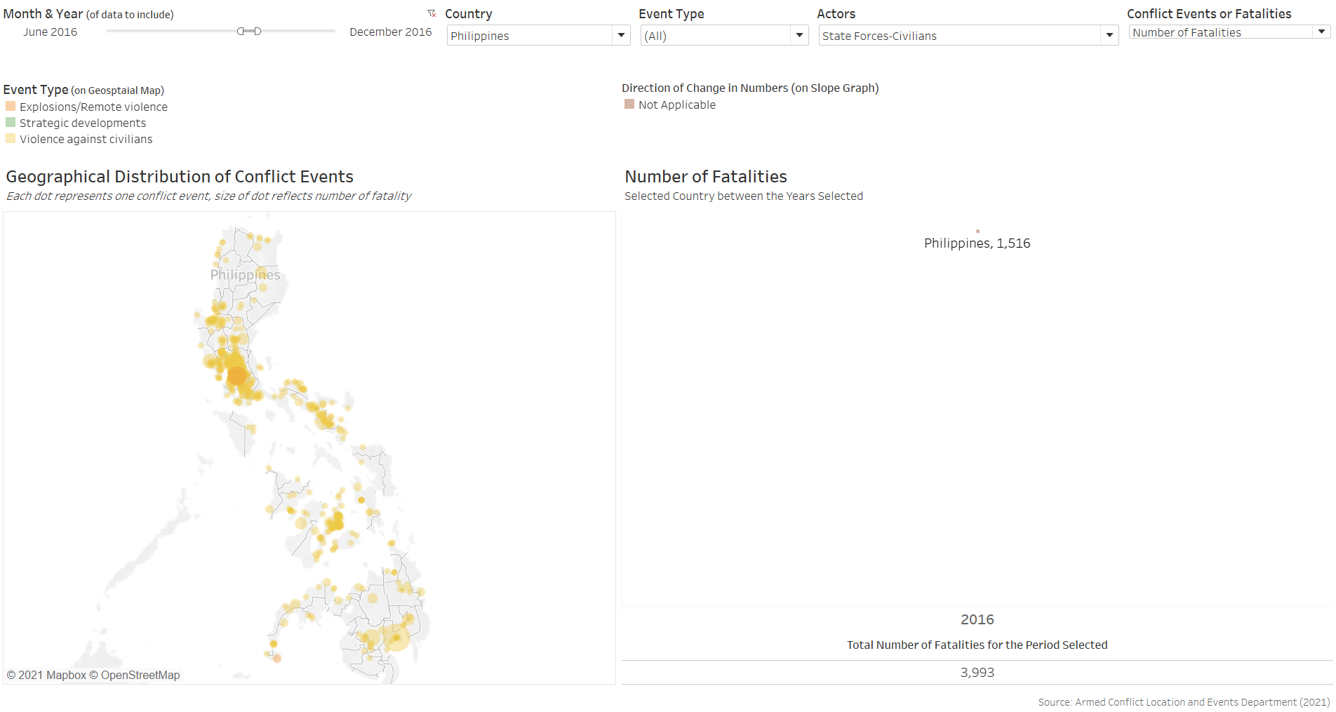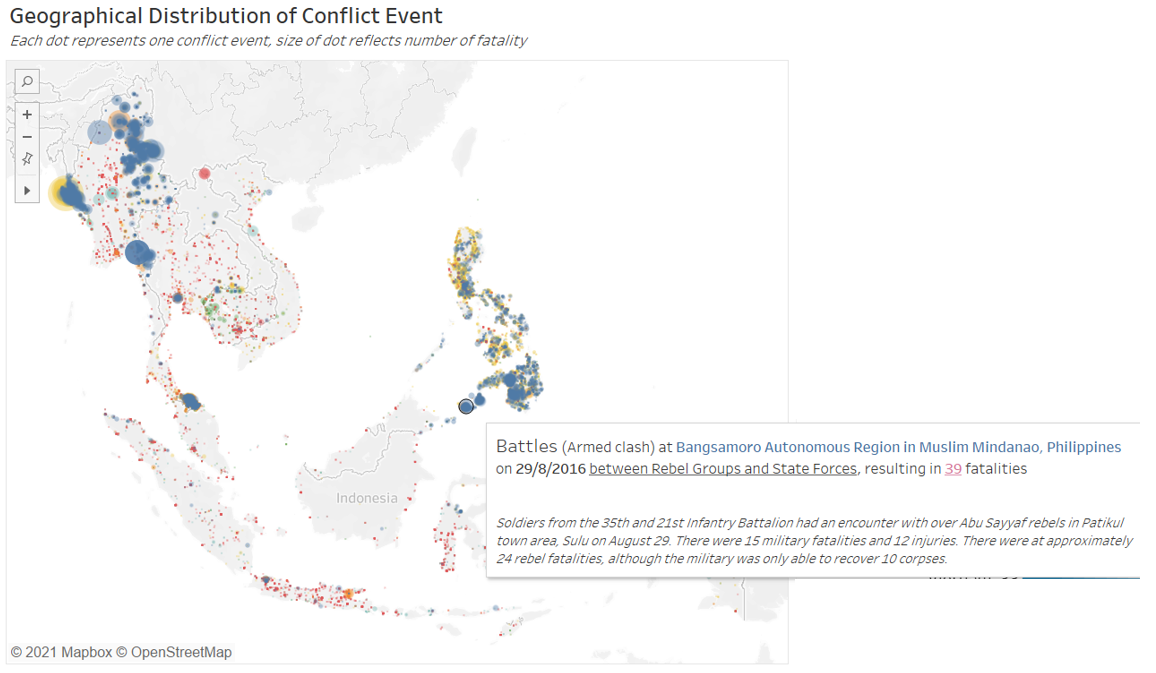 Furthermore, the benefit of having the changes dynamically animated is not strong in the context of conflict events, which occurrences are more ad hoc in nature than other events, such as child mortality or basic education, where changes in their rates are more meaningfully tracked through its temporal progression. In contrast, conflict events are more “opportunistic” - indeed, they may increase or decrease through particular periods of interest, but these are consequently also periods of particular interest - it is unlikely for people to be interested in knowing the number of conflict events in Singapore between 2010 to 2020 simply because it is not a period of any particular interest. Conversely, it is interesting to know the number of conflict events, say, in the Phiippines from Jun 2016, when President Rodrigo Duterte assumed office and declared its “war on drgs” - this is a particular period because it is of particular interest (versus infant mortality rate or education rate, which is more actively tracked and hence the changes year-on-year is more meaningfully analysed).