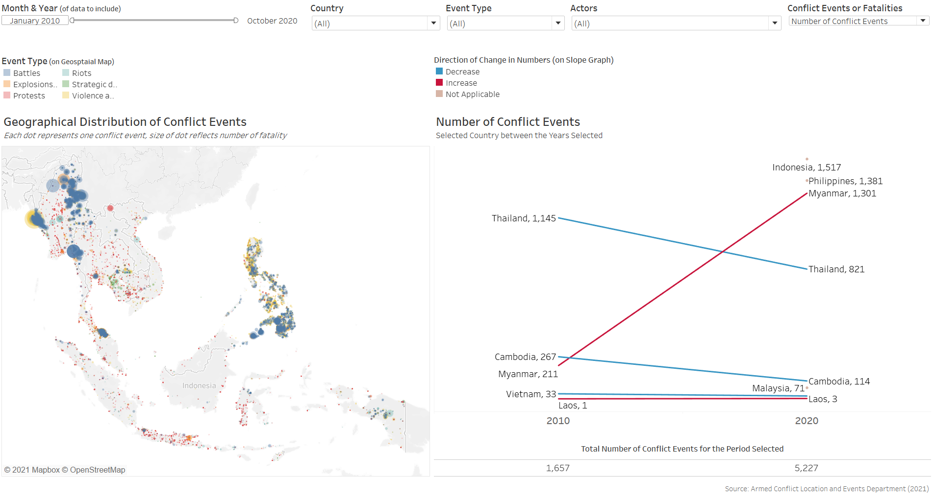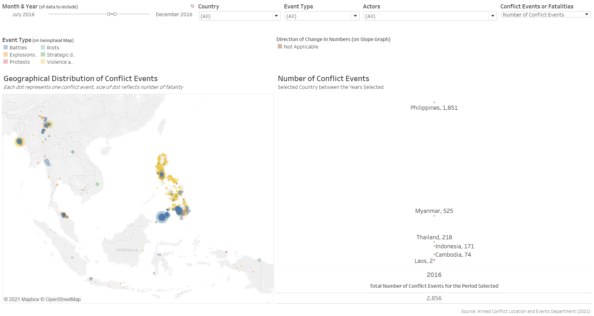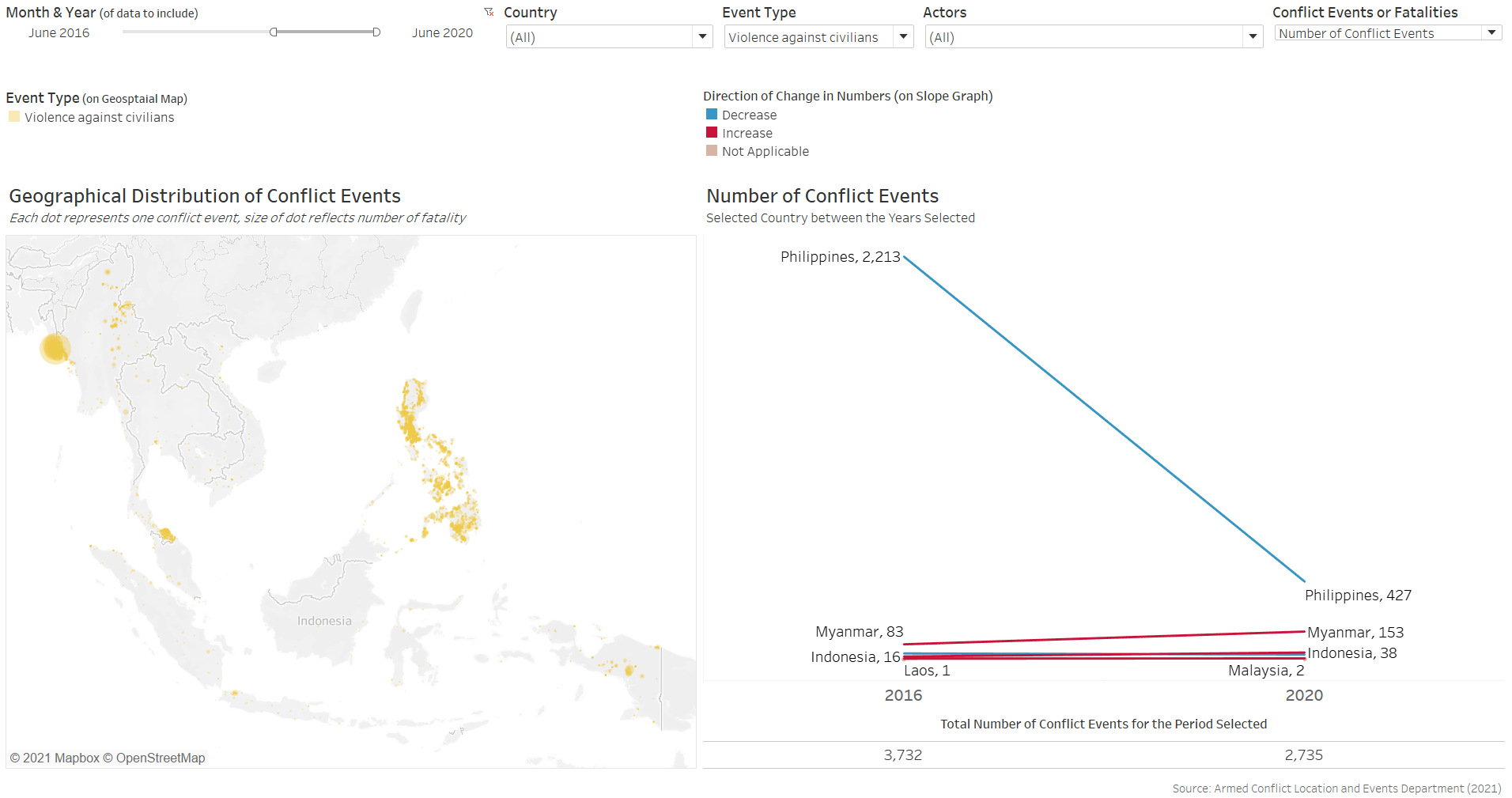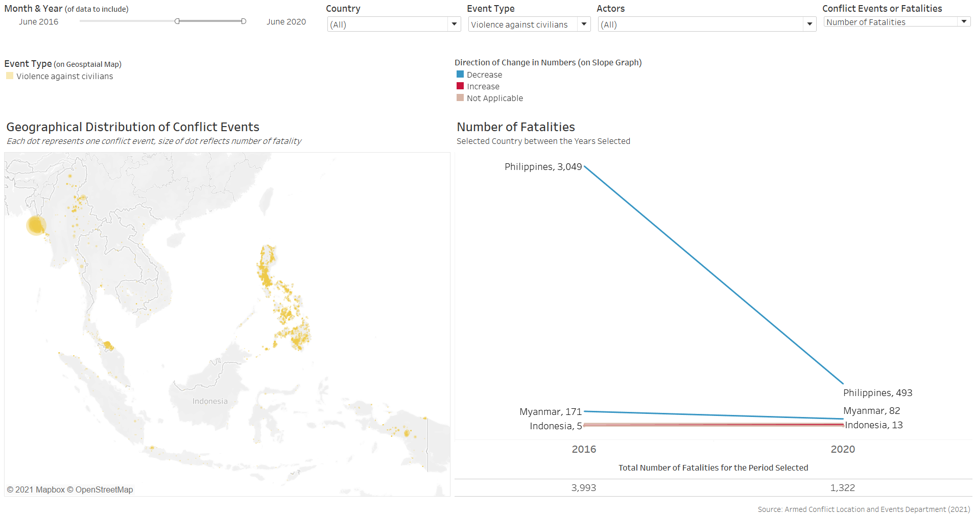 Furthermore, the benefit of having the changes dynamically animated is not strong in the context of conflict events, which occurrences are more ad hoc in nature than other events, such as child mortality or basic education, where changes in their rates are more meaningfully tracked through its temporal progression. In contrast, conflict events are more “opportunistic” - indeed, they may increase or decrease through particular periods of interest, but these are consequently also periods of particular interest - it is unlikely for people to be interested in knowing the number of conflict events in Singapore between 2010 to 2020 simply because it is not a period of any particular interest. Conversely, it is interesting to know the number of conflict events, say, in the Phiippines from Jun 2016, when President Rodrigo Duterte assumed office and declared its “war on drgs” - this is a particular period because it is of particular interest (versus infant mortality rate or education rate, which is more actively tracked and hence the changes year-on-year is more meaningfully analysed).