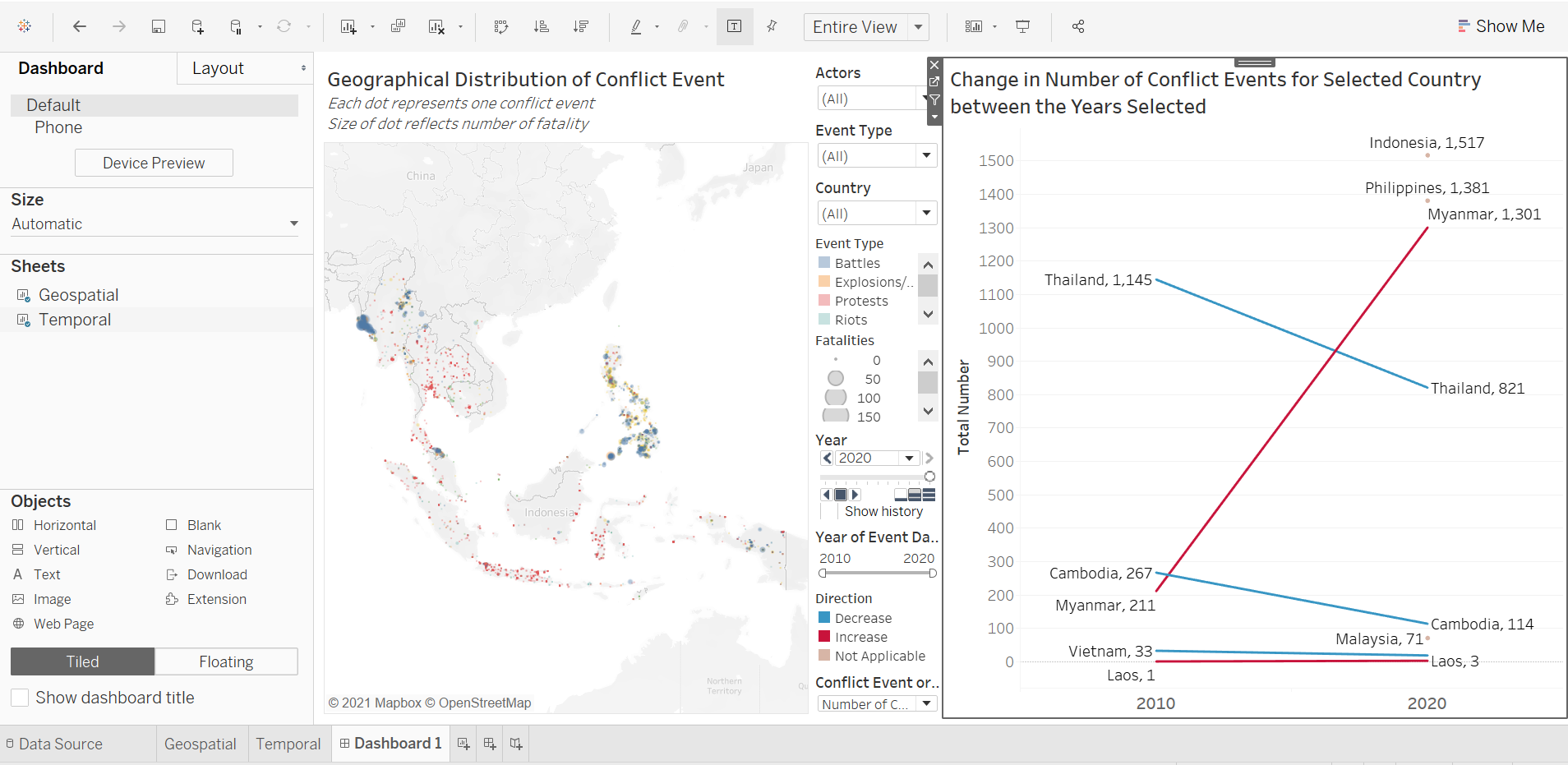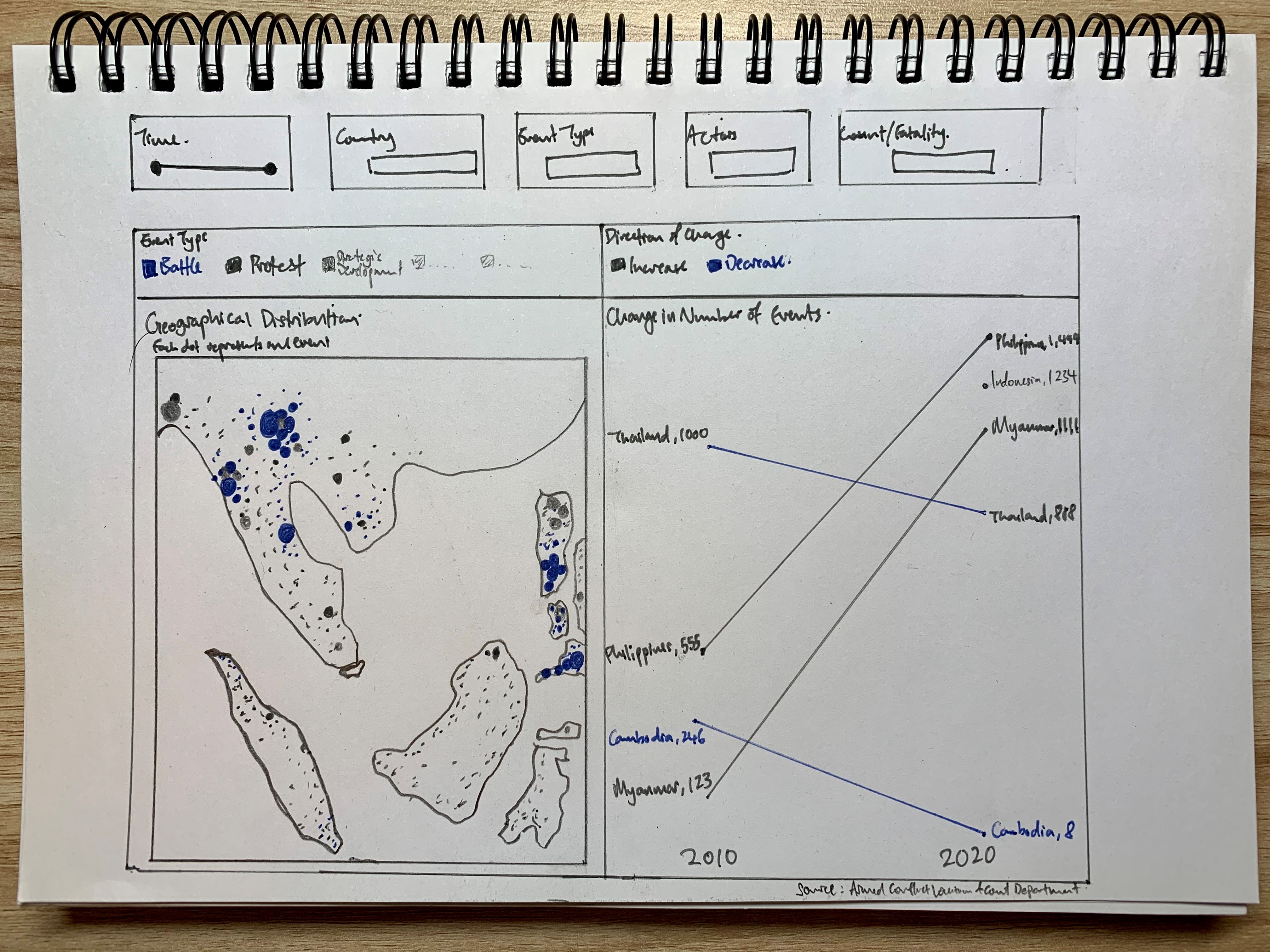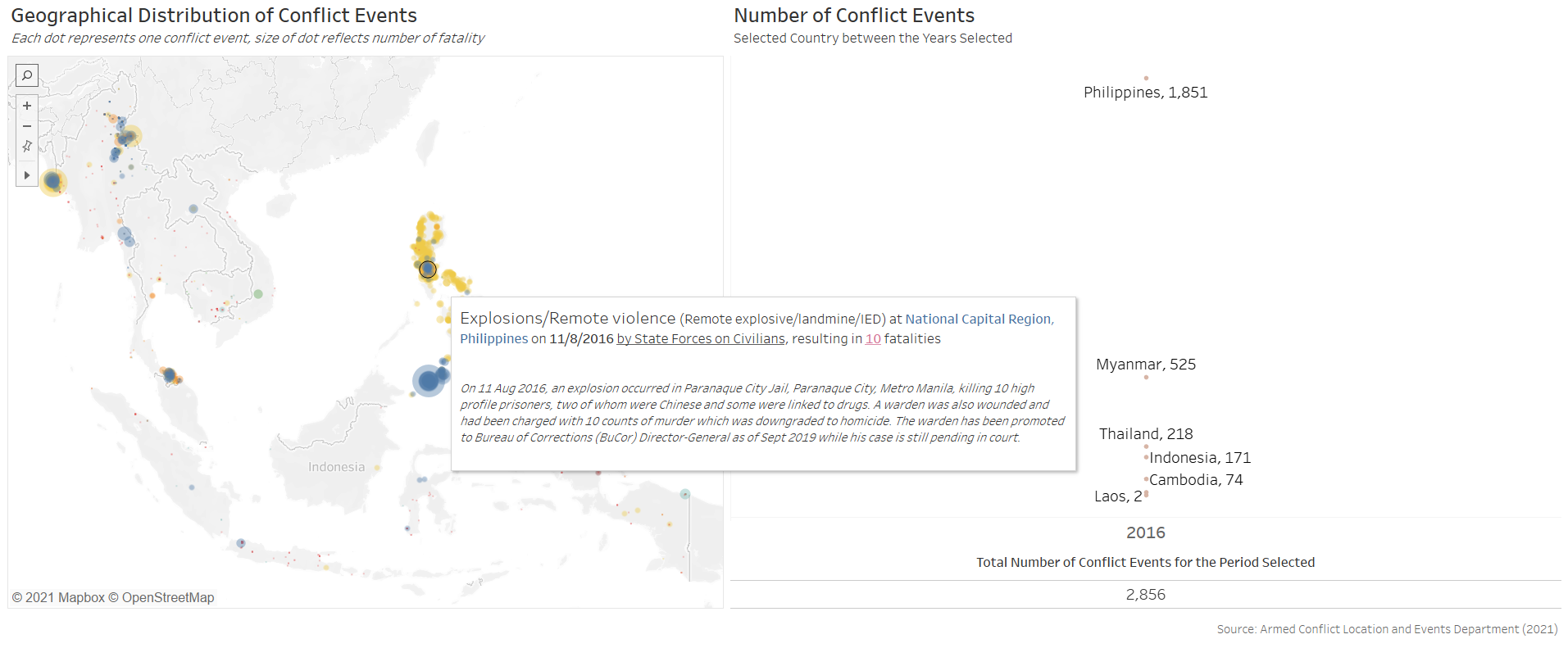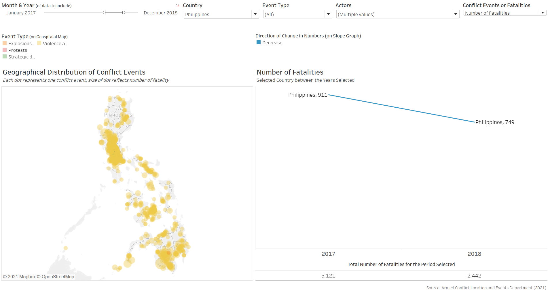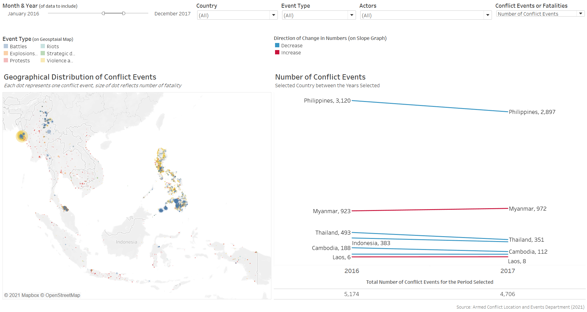 Furthermore, the benefit of having the changes dynamically animated is not strong in the context of conflict events, which occurrences are more ad hoc in nature than other events, such as child mortality or basic education, where changes in their rates are more meaningfully tracked through its temporal progression. In contrast, conflict events are more “opportunistic” - indeed, they may increase or decrease through particular periods of interest, but these are consequently also periods of particular interest - it is unlikely for people to be interested in knowing the number of conflict events in Singapore between 2010 to 2020 simply because it is not a period of any particular interest. Conversely, it is interesting to know the number of conflict events, say, in the Phiippines from Jun 2016, when President Rodrigo Duterte assumed office and declared its “war on drgs” - this is a particular period because it is of particular interest (versus infant mortality rate or education rate, which is more actively tracked and hence the changes year-on-year is more meaningfully analysed).