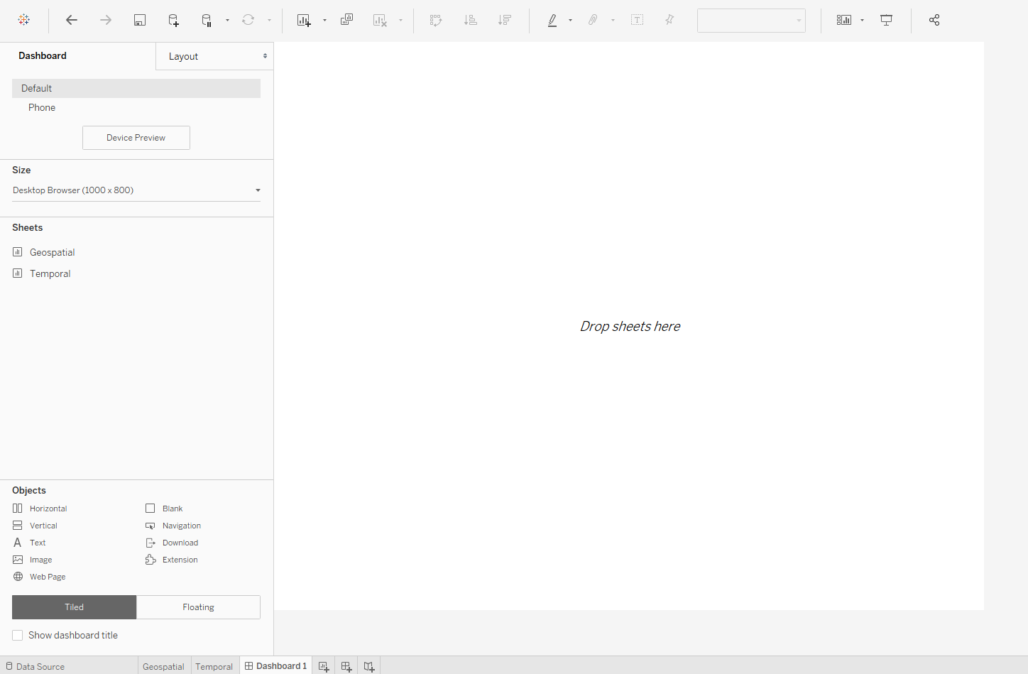 Now we commence with the creation of Dashboard by first clicking on the “New Dashboard” button at the botton of the viz (beside the Worksheet tabs).