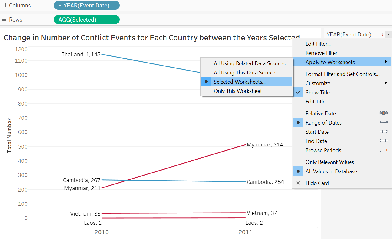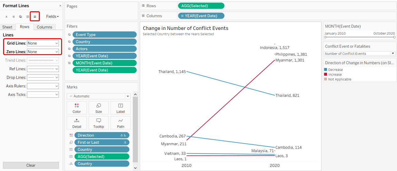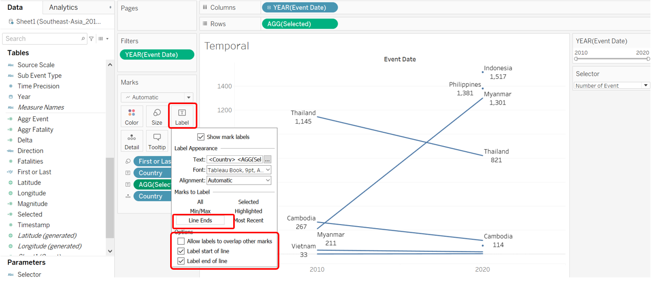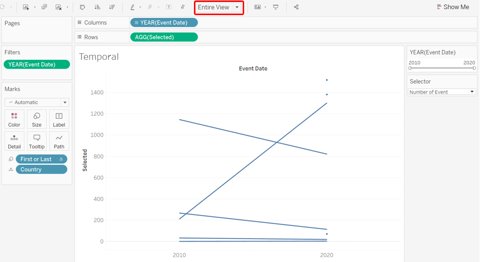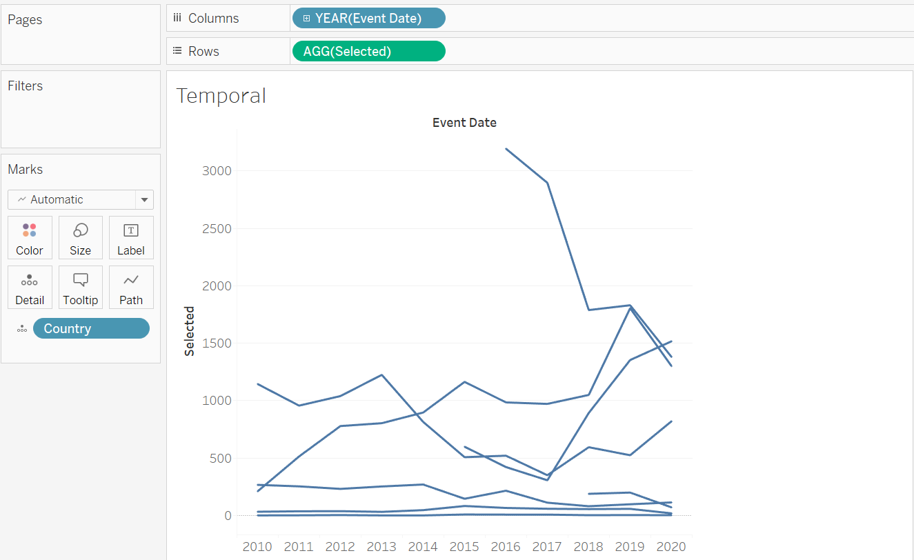 To create a basic Slopegraph, drag-and-drop the Event Date dimension to Columns, the Selected variable (that takes in user selection of either number of fatalities or events) into Rows, and Country into the Detail tab.