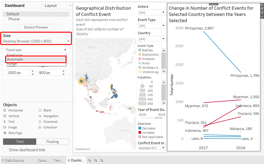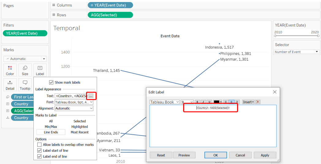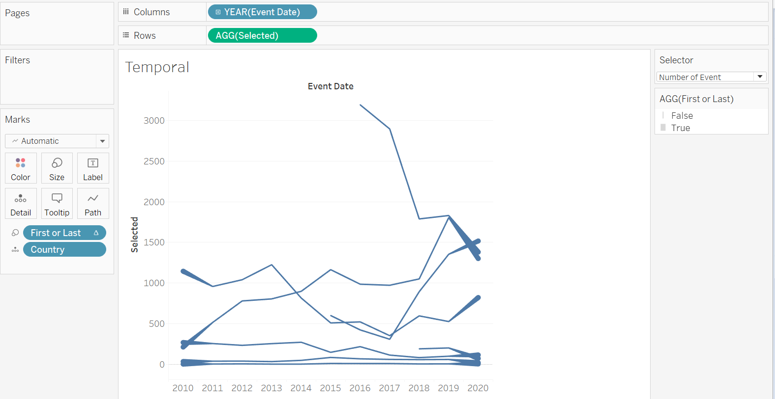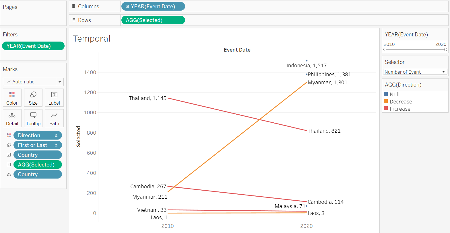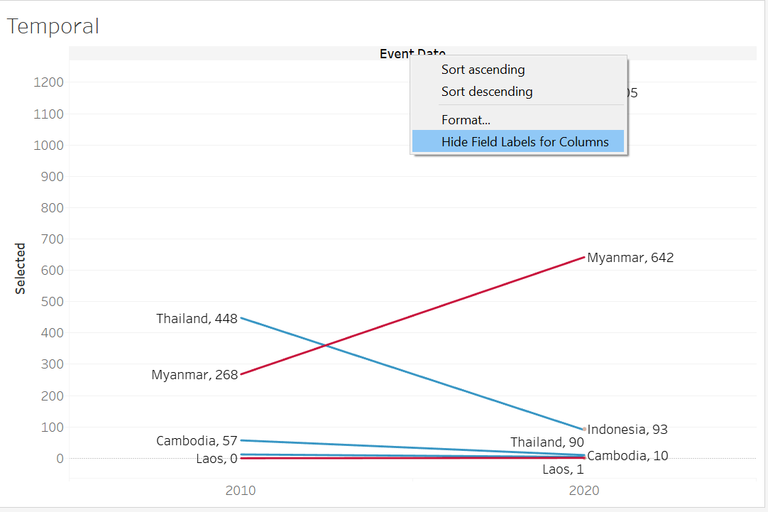 To create a basic Slopegraph, drag-and-drop the Event Date dimension to Columns, the Selected variable (that takes in user selection of either number of fatalities or events) into Rows, and Country into the Detail tab.