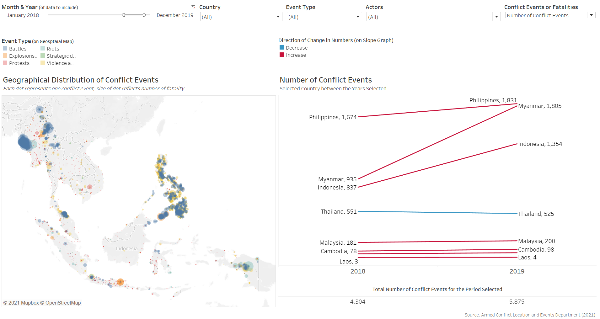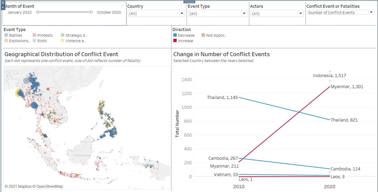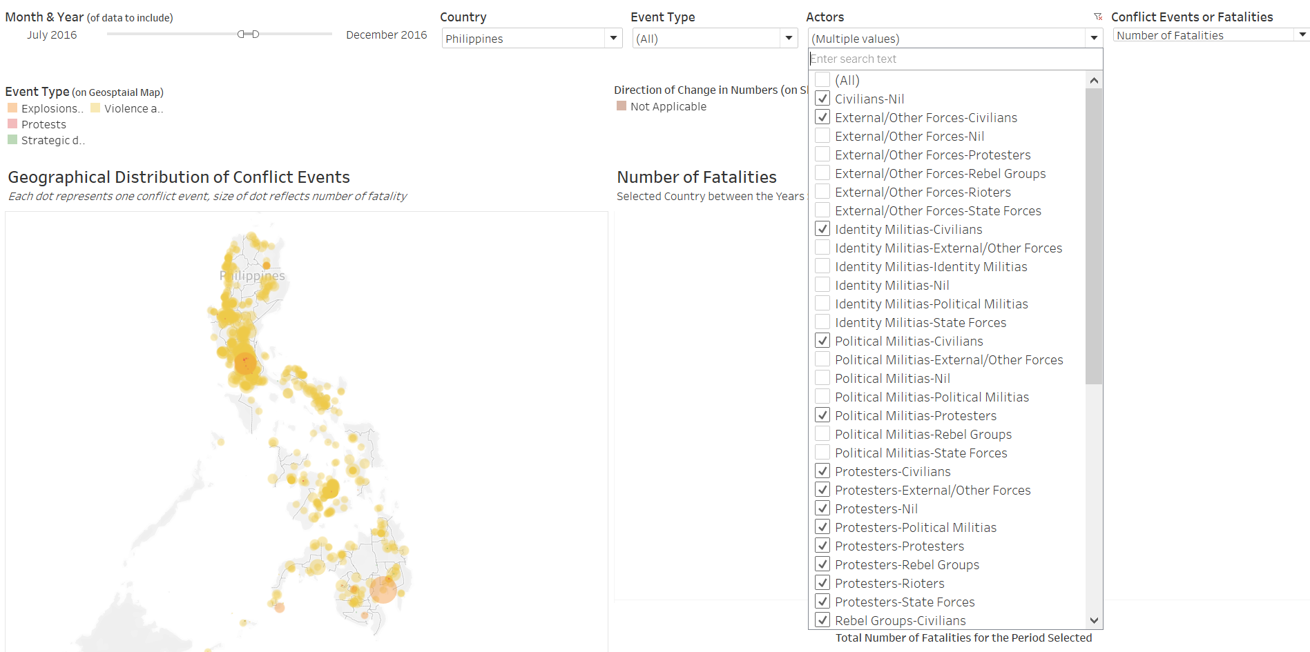 | 3 | Lack of Interactivity | Other than the toggling of Country, the viz does not allow changing other variables such as Actors involved or the type of conflict event. |