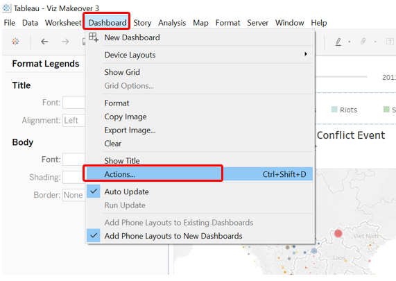 Add in Action to interlink the two sheets. First click on the Dashboard tab at the toolbar, then select “Actions…”