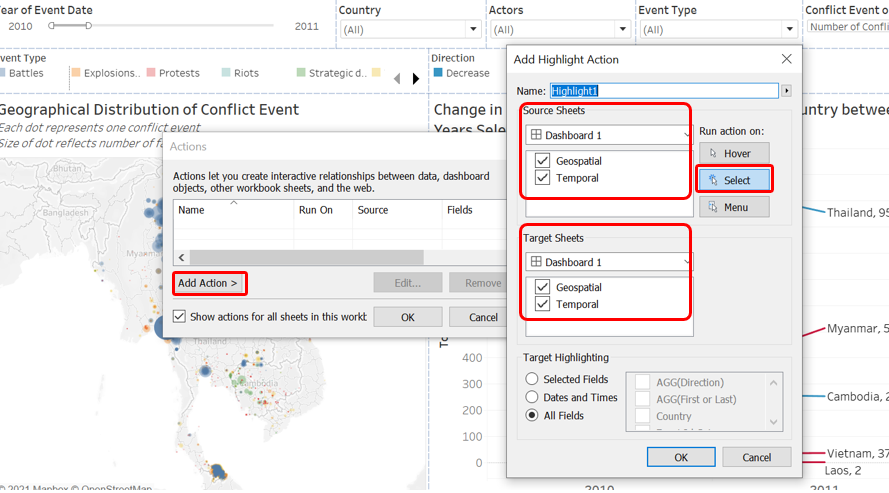 Similarly, we return to the Geospatial Worksheet and do the same to the Actors, Country, and Event Type filters.