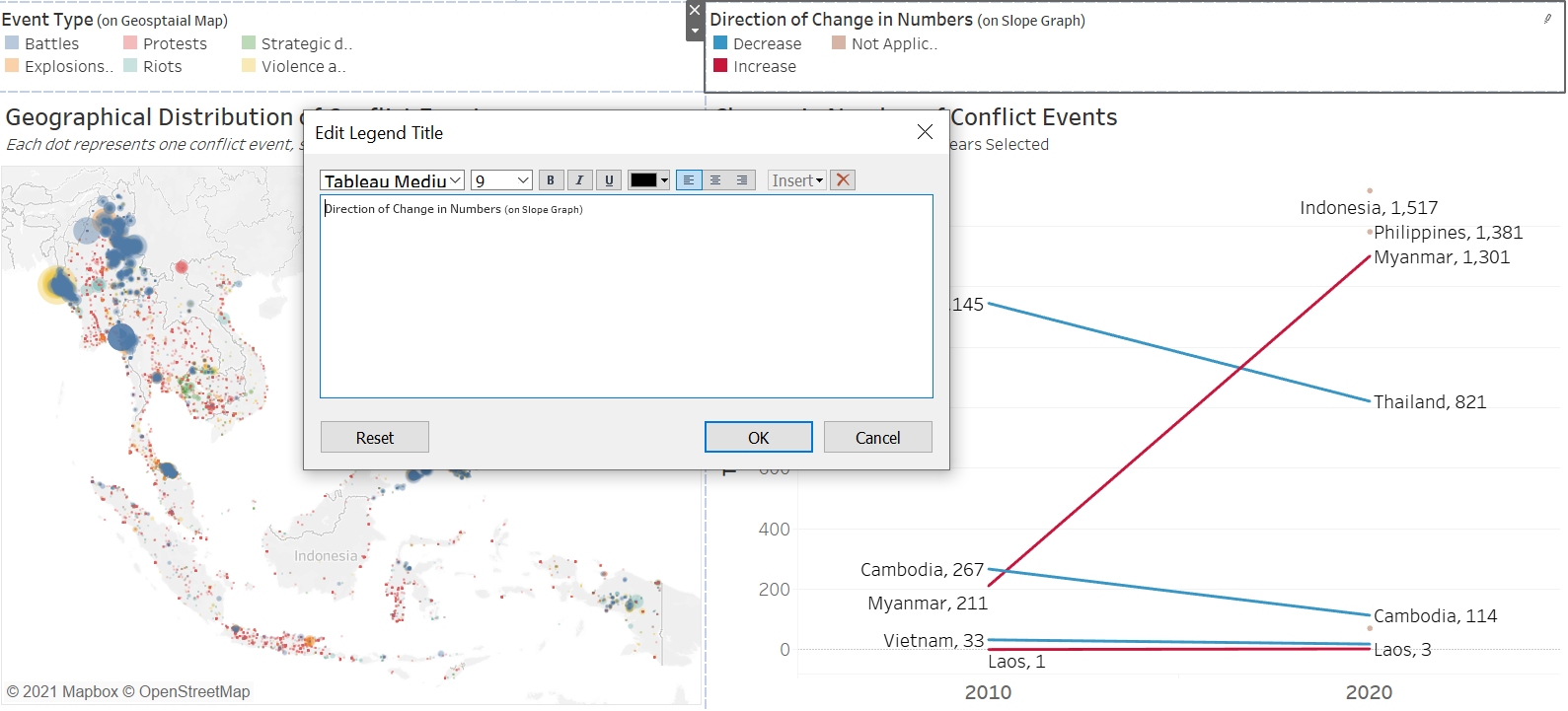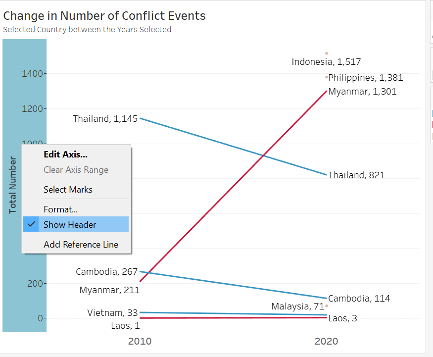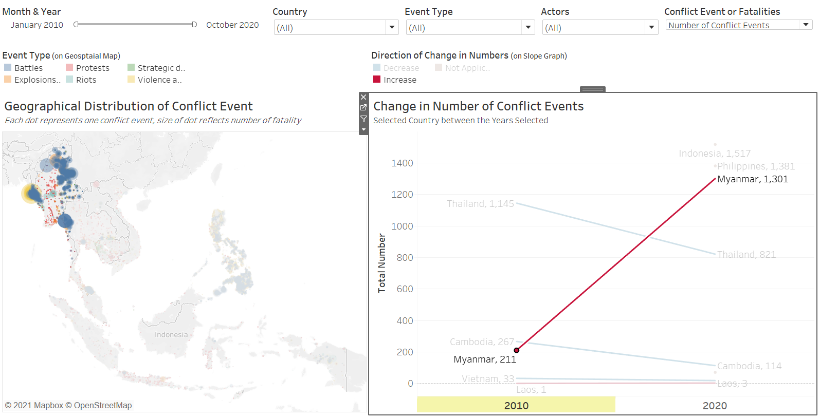| 7 | UnInformative Temporal Viz | The trellis pane viz does not have any value-add in the story told - perhaps a simple get-around is to just put all the different types in on continuous axis and differentiate the lines by different colors (consistent with what is on the map). However, authors should be mindful of the story they are interested to tell - if the changes within two particular years are not important to the viewer (i.e. how the lines change), having many kinks in the line creates more confusion. In this case, since conflict events are more ad-hoc in nature, it is more likely for viewers to be interested to know how the numbers changed from one timeframe to another (e.g. 2010 to 2020), instead of all the changes in between. A slopegraph would provide that clearer picture without additional encumbrances. If user really wants to, an option to change the start and end year may be provided to allow users to toggle between the start and end timeframe that they wish to look at. |
