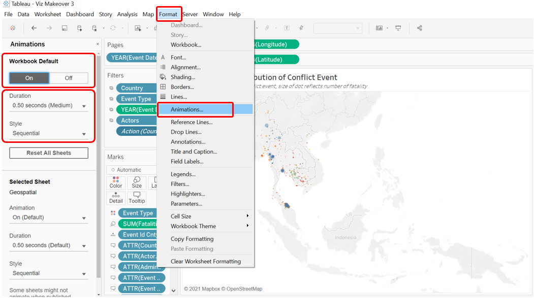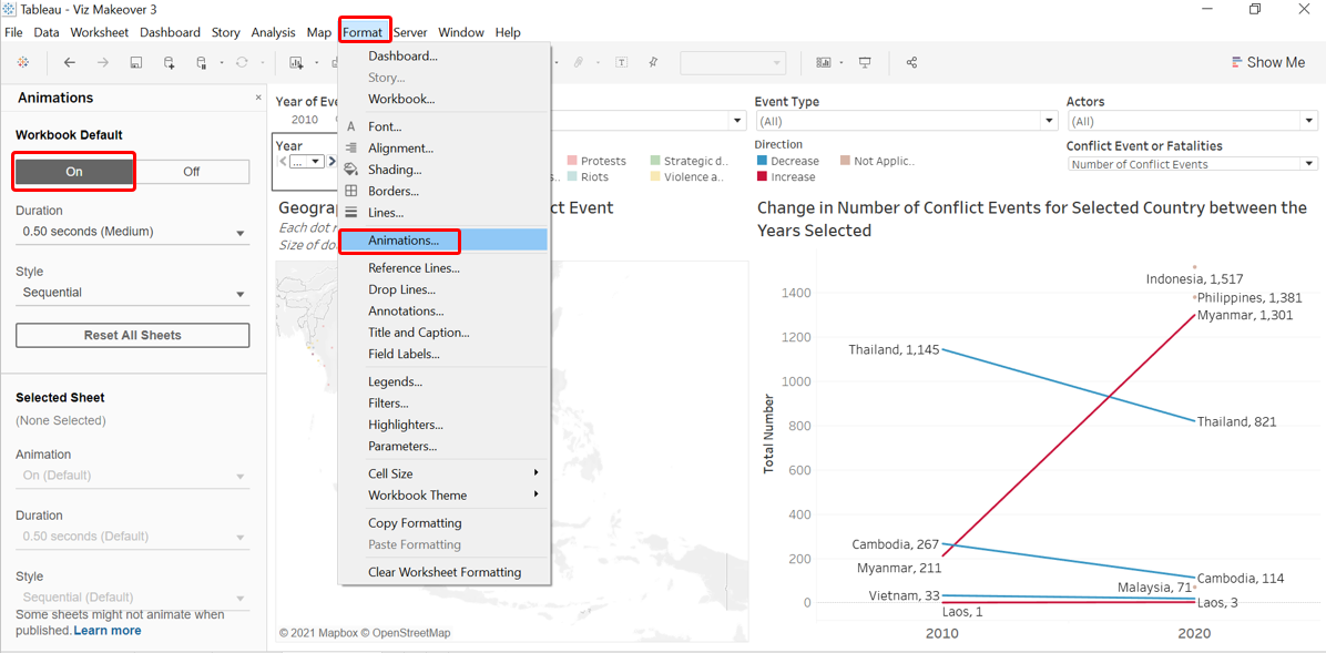Finally, we head to the Dashboard and confirm that the animation is on by clicking on the Format tab on the Toolbar, selecting “Animations…” then check that it is on “On”