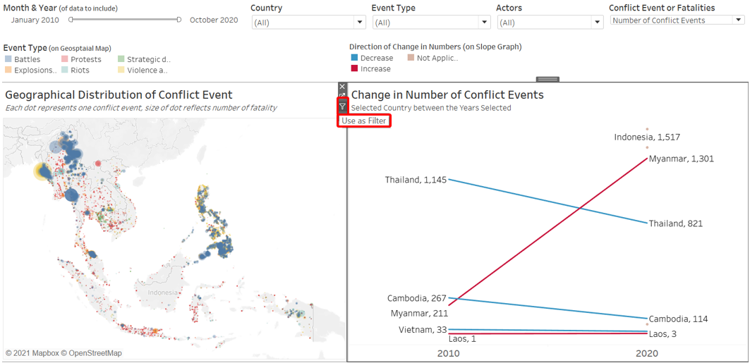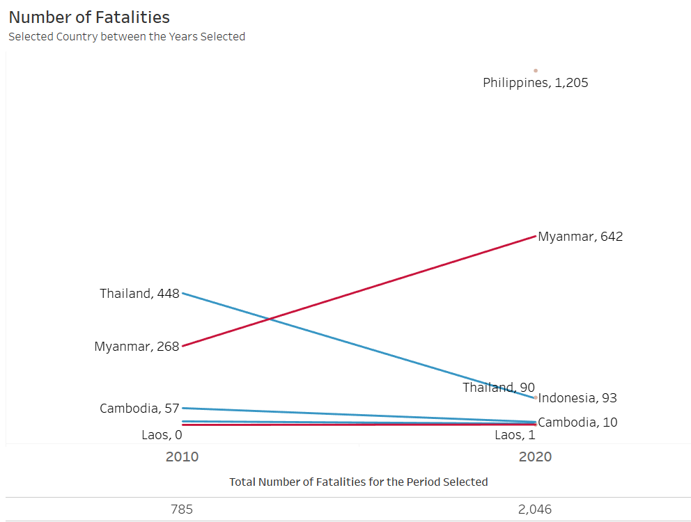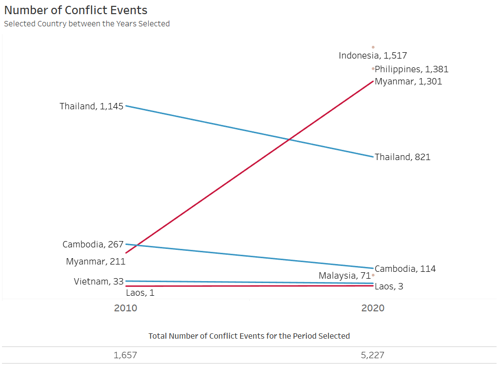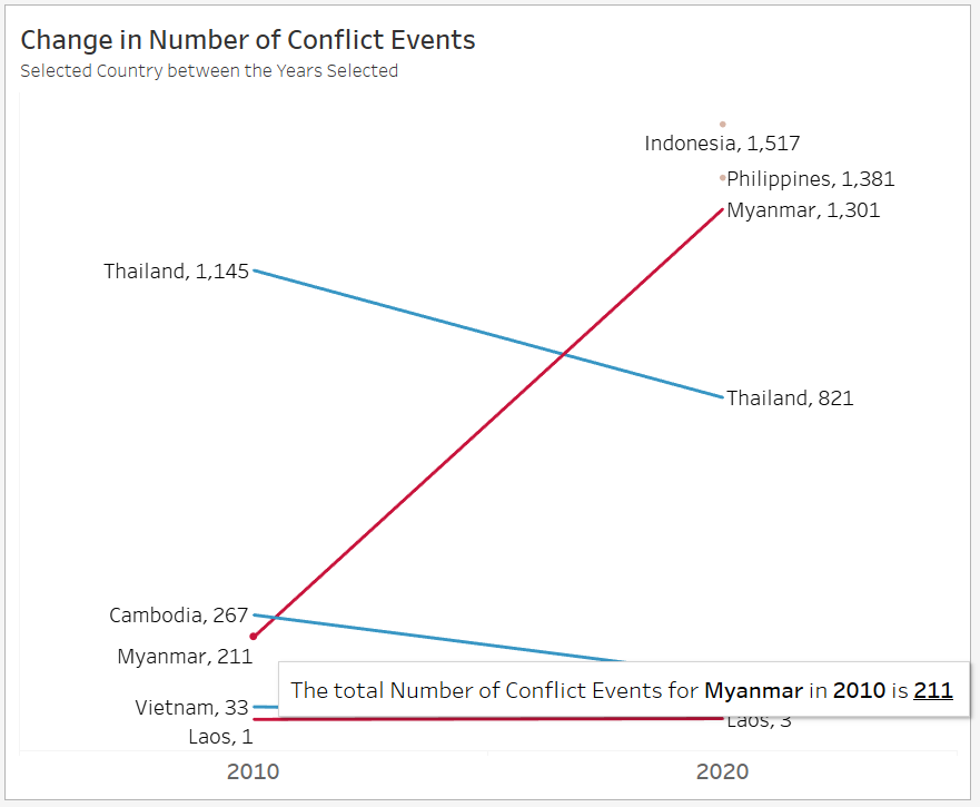 In fact, Myanmar was not even the country with the most conflict events for the first 10 months of the 2020s - Indonesia with 1,517 and the Philippines at 1,381 ranked first and second respectively. The reason we see them as a dot instead of connecting lines is only because there were no data available back from 2010.