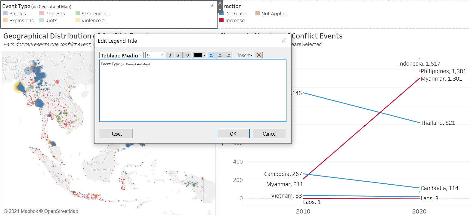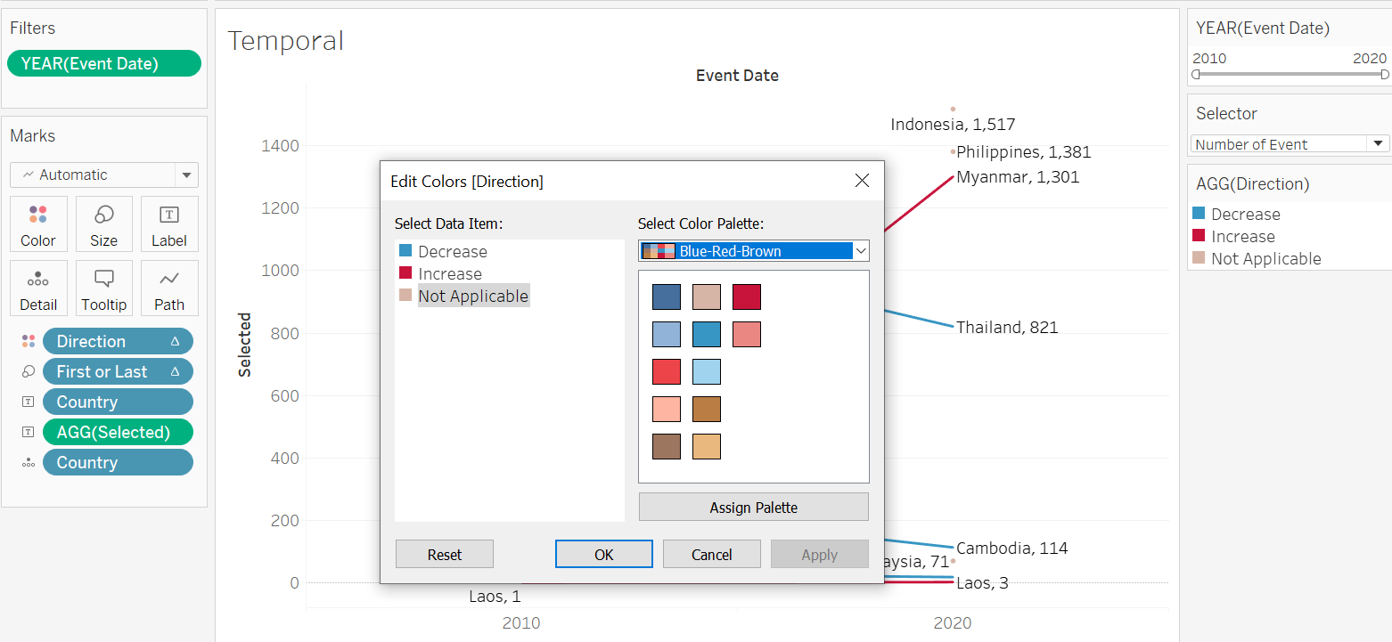 Double-click on the AGG(Direction) legend pane to edit the color - we want blue to denote decrease (since decrease in conflict event or fatality is good), while red to denote increase in the unfortunate numbers. We select the Blue-Red-Brown palette, then make the appropriate changes. “Not Applicable” in this case denotes countries where either the start or the end year data is not found (and hence we cannot visualize the change between the two years)