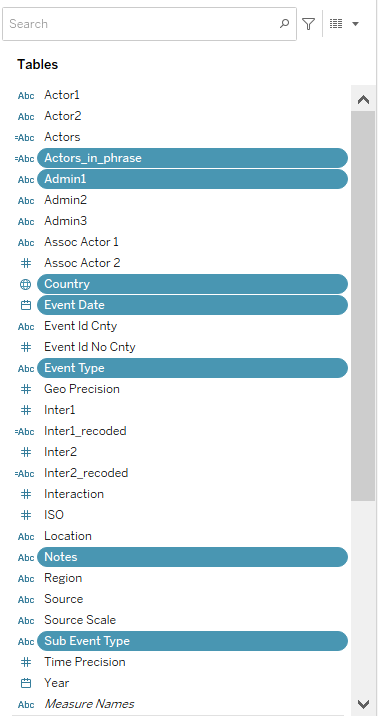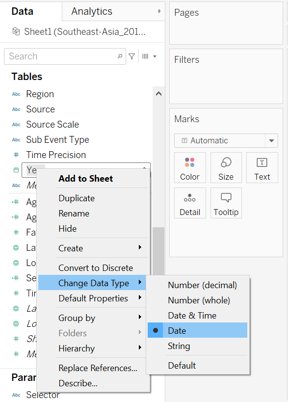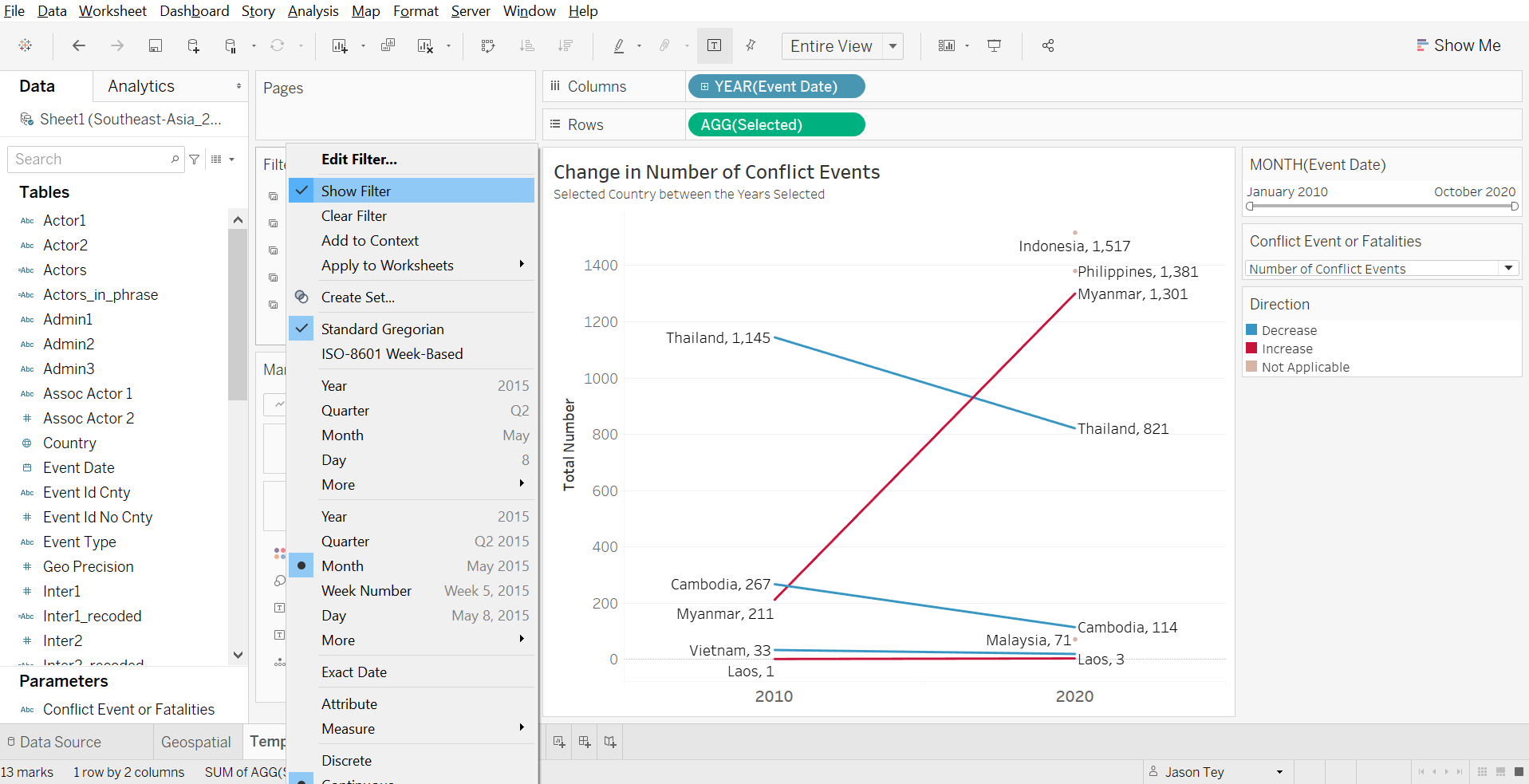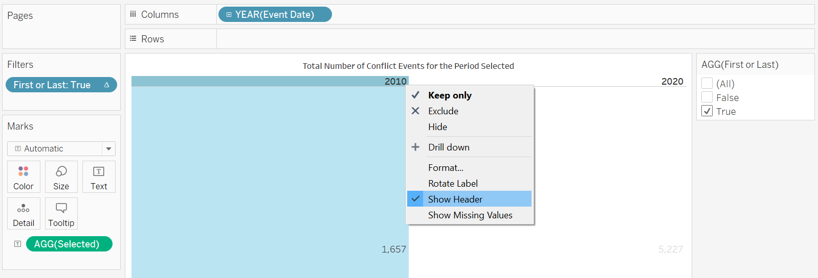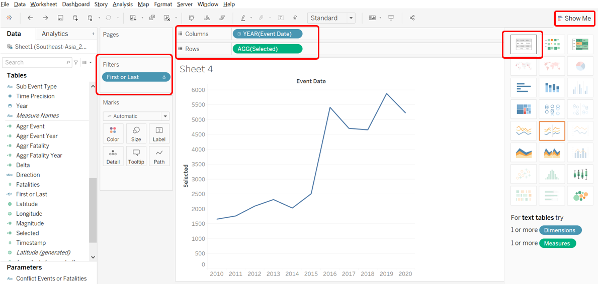 We include one more additional information: the total number of conflict events or fatalities for the period selected. We first open up a new worksheet, drag-and-drop the Event Date onto the column, Selected field onto the Rows, First or Last onto Filters, then under the “Show Me” tab, select the data table option.