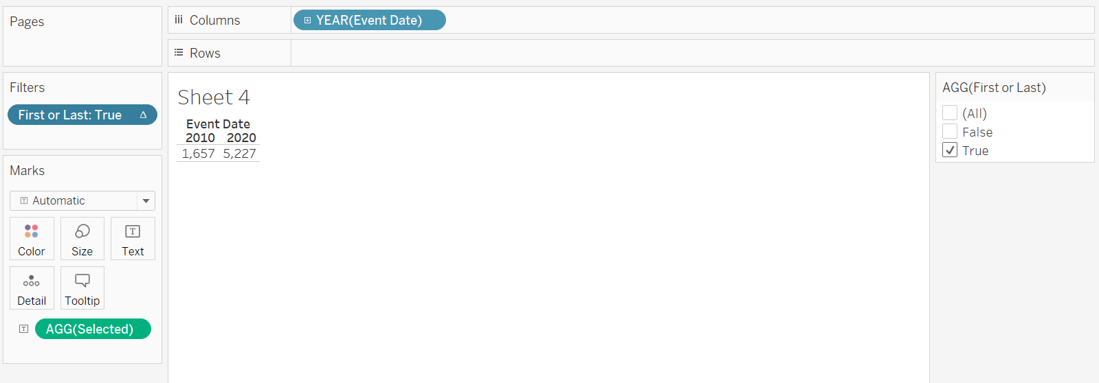 Next, we go to the right hand panel where we find the “AGG(First or Last)” distribution pane; we right-click on the False legend, and select “Hide”