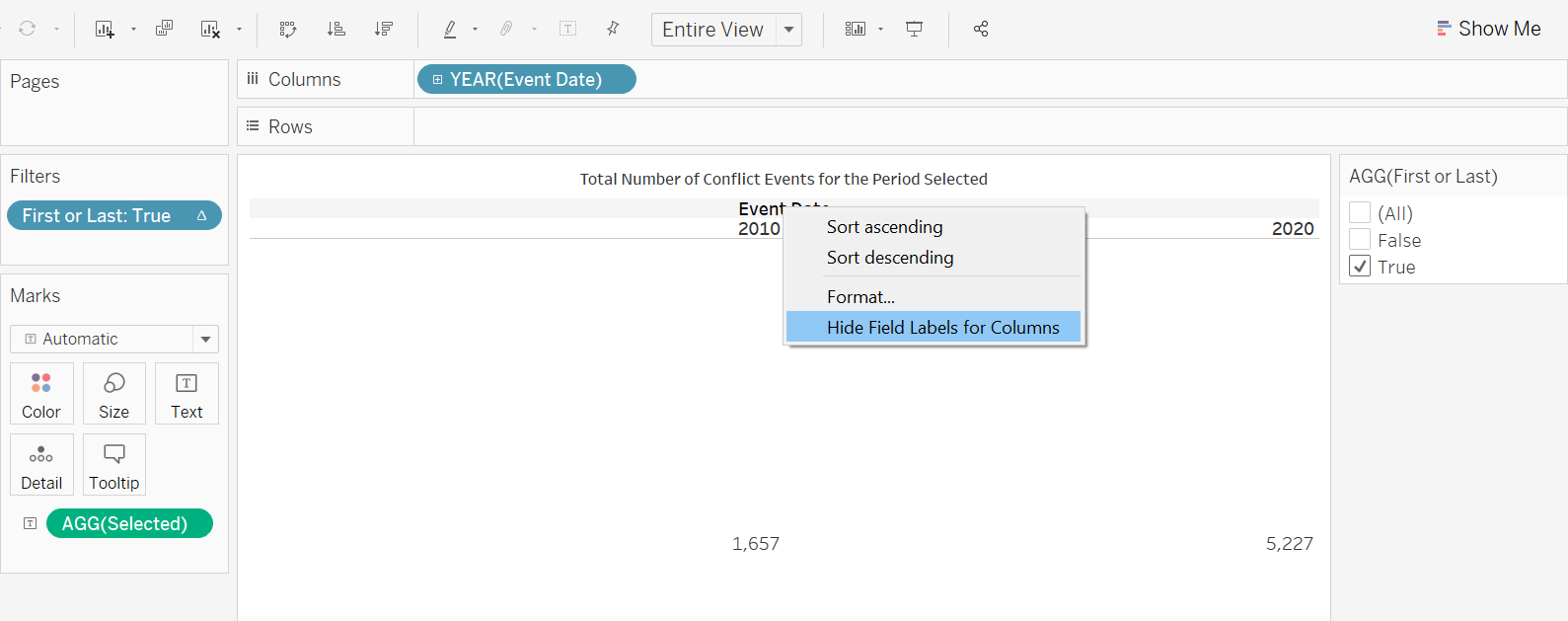 We right-click on the title, select the Hide Field Labels for Columns to hide away the Column field label, which is not needed. Remember to also select “Entire View” for the view.