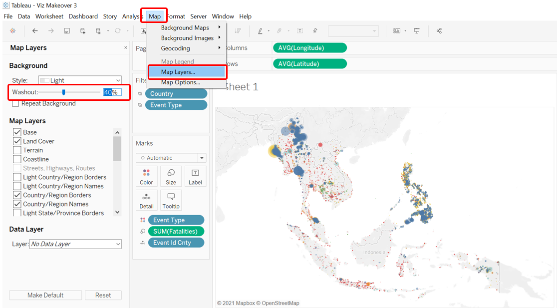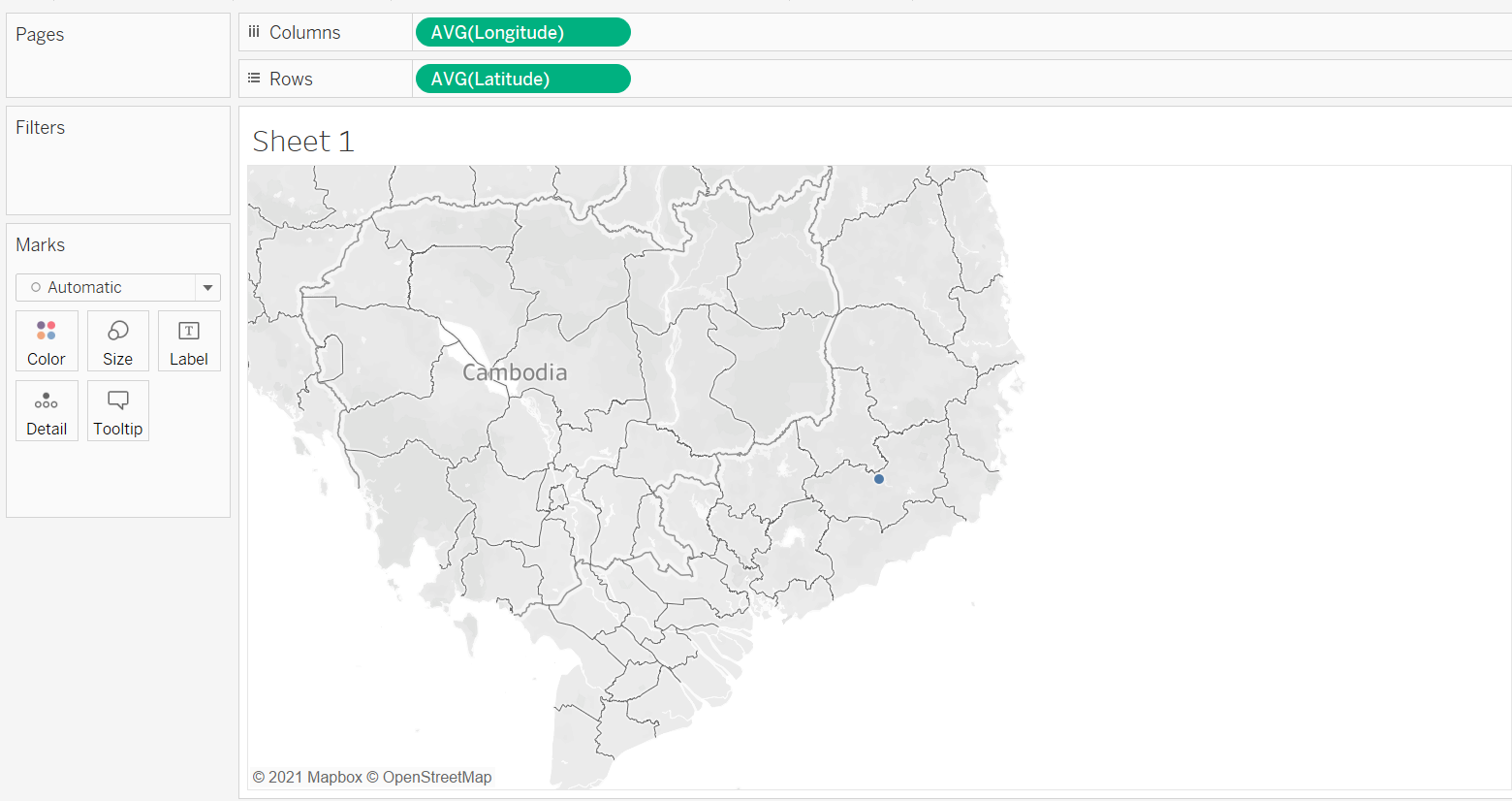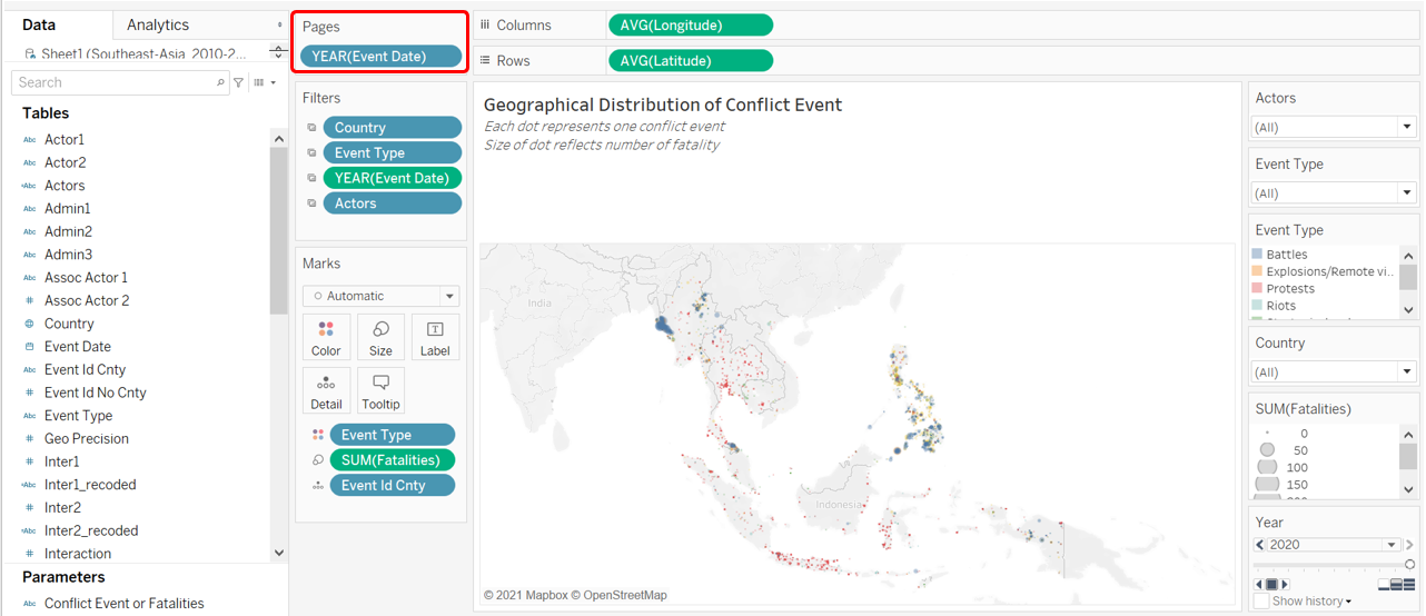 The very first step to creating a geospatial visualization is to create a base map. The dataset conveniently came along with Longitudinal and Latitudinal data to map out where each of the conflict event happened; Tableau on the other hand, made it even easier by automatically recognizing that these variables have geographical role and assigned them to their correct lat-long meaning based on their name. We now drag the Longitude to Columns, and Latitude to Rows.