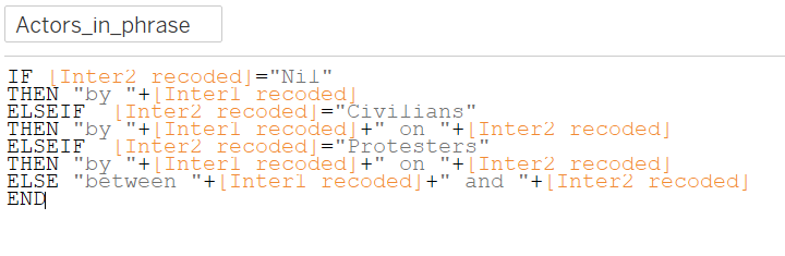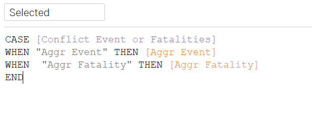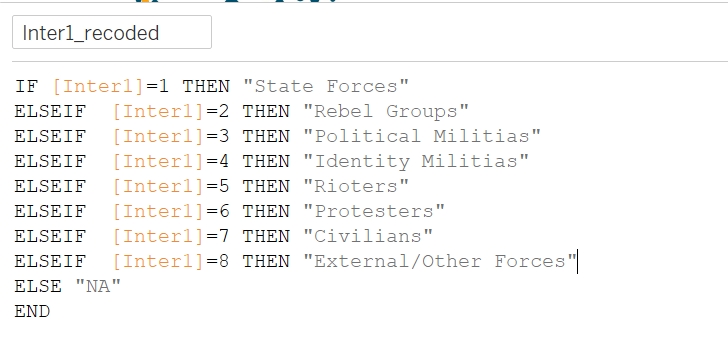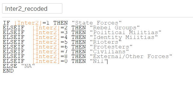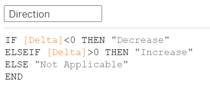 We then use Delta to find out the direction of movement of the numbers of conflict event/fatalities between any two years by creating the following Direction variable