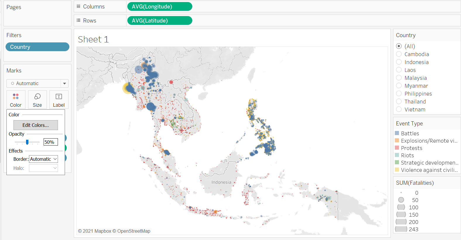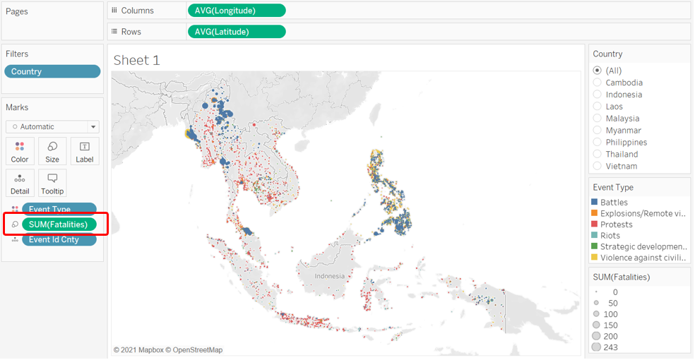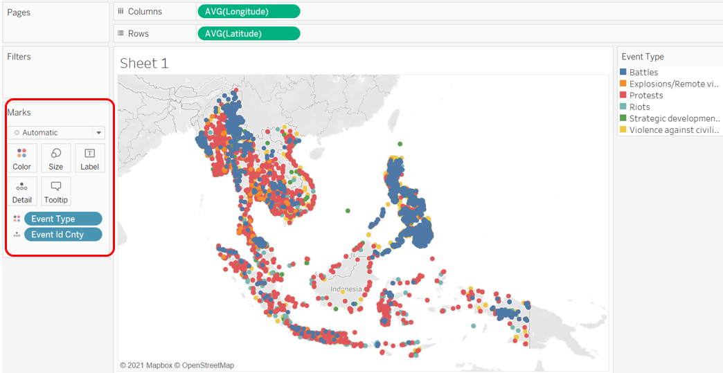 We create a basic dot density map by drag-and-dropping Event Id Cnty onto the Detail tab. As with any one-to-one dot density map, each of the resulting dot represents one count of the variable - in this case, a conflict event. We further enhance the map by introducing another variable - Event Type - onto the Color tab. This added dimension allows viewers to identify the type of event (e.g. Battle, Protest, Riot) associated with each event.