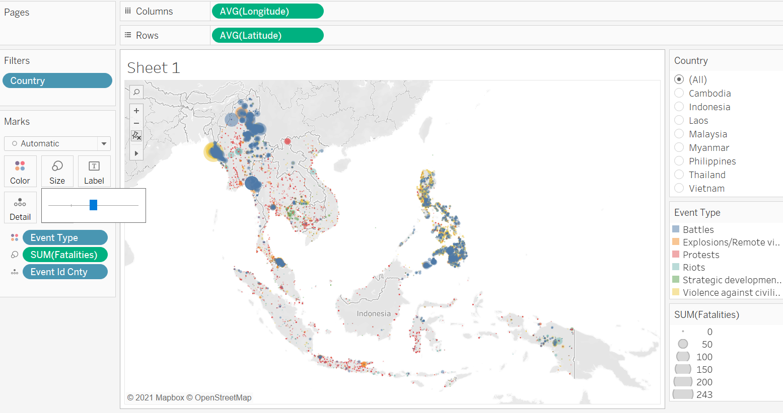Even while the battle events concentrate only in Myanmar and the Philippines, there appears to be some difference in their deadliness - blue dots in Myanmar are visibly much bigger than those in the Philippines.