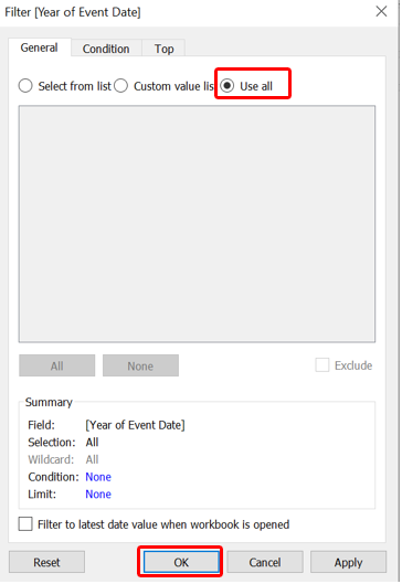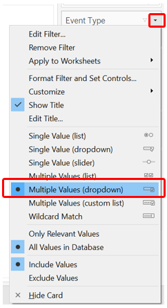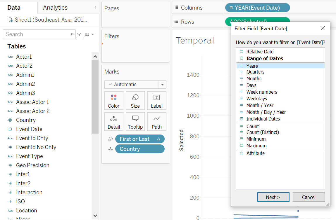 We first drag-and-drop the Event Date variable onto the Filter pane. A pop-up will appear - we select “Years” from the option list (this is just for place-holding, we will change it to month later below, with explanations)