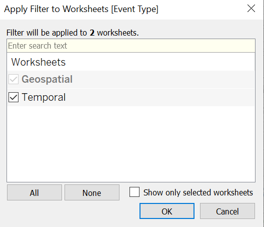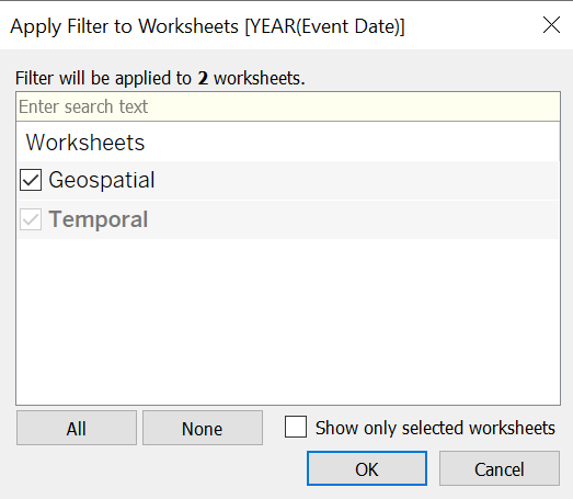 Next, check the other worksheet (in this case, “Geospatial”), in order for this filter to also apply to the geospatial dot density map viz.