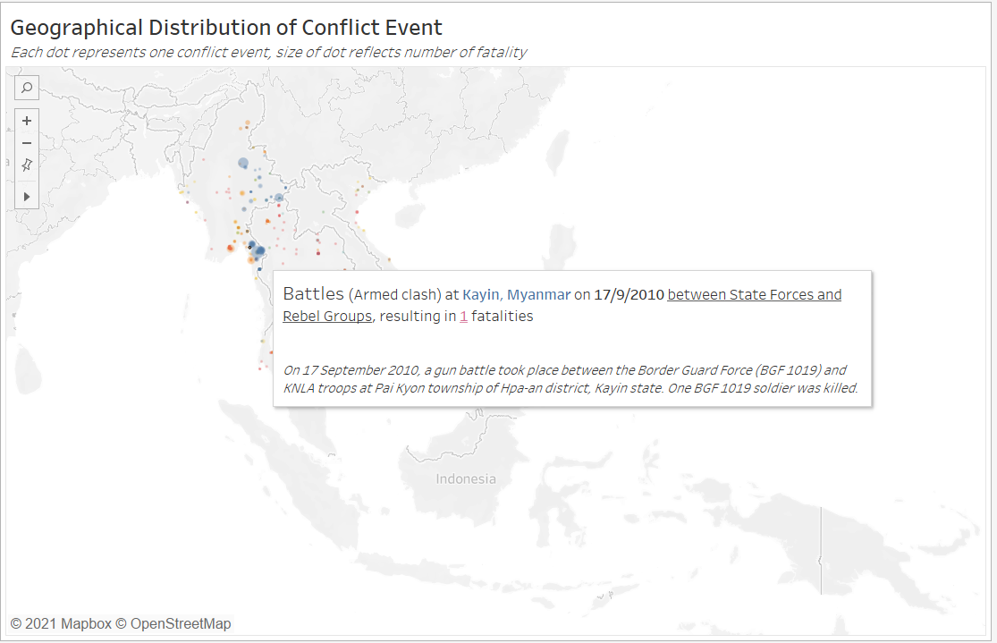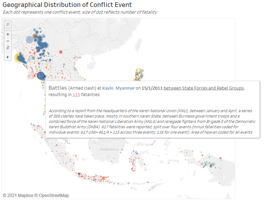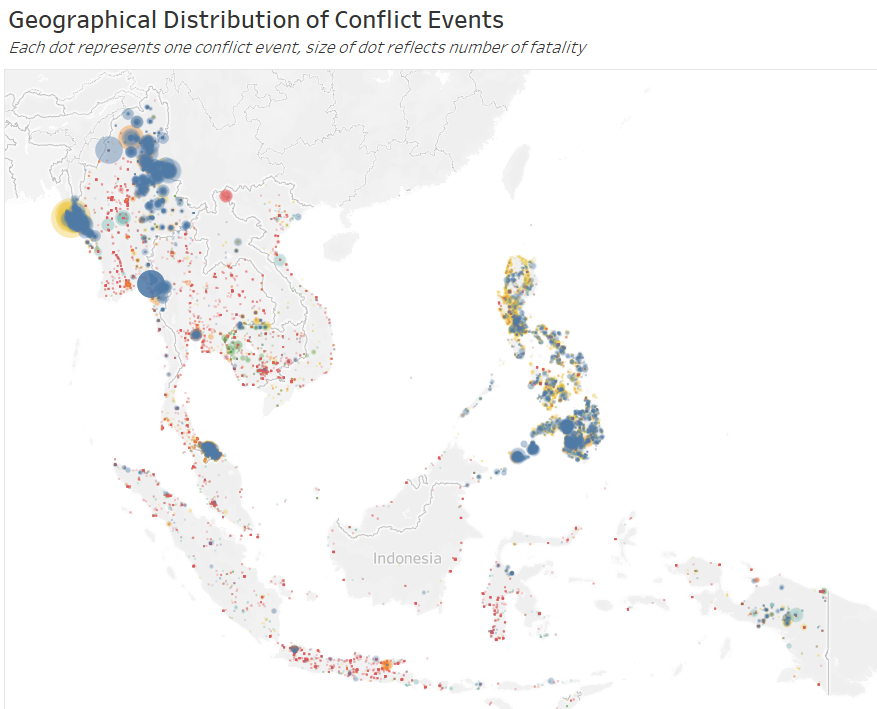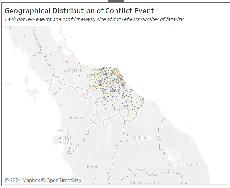 There also appears to an anomalously large blue dot in Southern Thailand (see figure above), however, on closer examination, this “dot” is actually formed by numerous smaller but highly concentrated blue and yellow (Violence against Civilians) within the southern Thailand states.