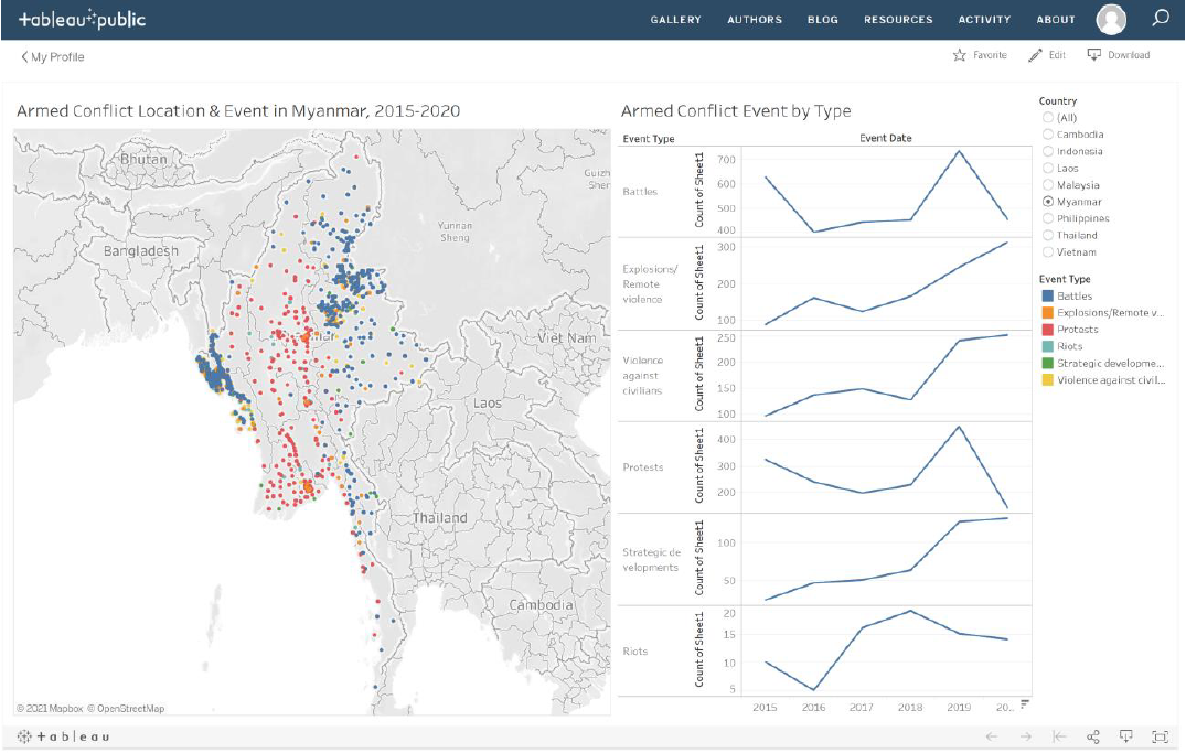 | 8 | Missing Credit for Source of Data | The source of data is mysteriously missing. This reduces the reliability of the data used (and could also get the viz producer into trouble, given the terms-and-condition for use of the data from ACLED) |