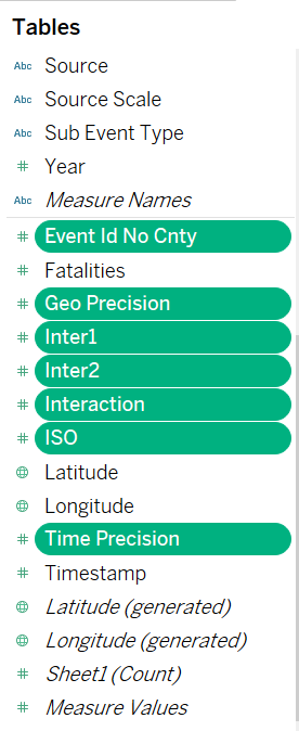 We can leave most of the data as-is, since they are relatively clean. We proceed to open up a new Worksheet in Tableau. Once that is done, we will quickly realize that Tableau automatically classified many of the numerical variables as Measures. We will need to shift these to become Dimensions. click on the following Measures while holding down the Ctrl key:-