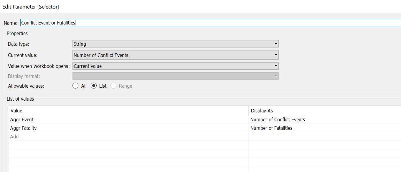 Points 1 and 2 are particularly important considerations in the context of our visualization - to visualize incidence of conflict events, further processing of the data (e.g. divide it by the population) would be required in order to adopt the Choropleth technique. Point 3 is an added bonus (given that Tableau has color functions available), since a Choropleth will rely on colors to represent the incidence of conflict event (in this case, potentially event per population), it loses the option to add on another dimension that a dot density map allows using color. In this case, one plausible measure to include, is the type of conflict event. In this case, each dot not only tells us that a conflict occur, but can very intuitively inform us whether it is a protest or a battle.