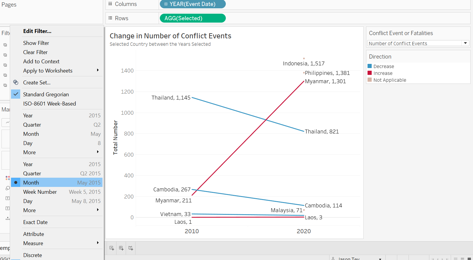 We notice that the Year pill under the Filter pane is a dimension (blue pill). We click on the small triangle at the right-end of the blue pill, a list will pop up - we then select the date Month option as shown. Recall in earlier discussion in Section B, there is a need for more specific temporal filter to analyze changes for particular period of interest (e.g. from June 2016 onwards in the Philippines for President Duderte’s term), hence, while we change the filter date type, we also change to allow more in-depth, per-month analysis (instead of leaving it as Year). The pill should turn green in color.