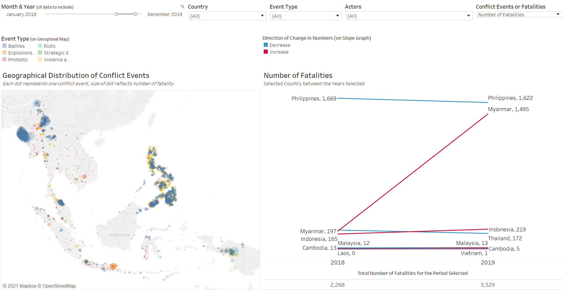 While Protests are the most ubiquitous, Battles (in blue dots), on the other hand, are less widely-spread within the region; it is more commonly observed only in Myanmar and the Philippines in the last decade. However, dots representing battles are visibly much bigger in size than any other colors (Event Types) - that is, many of these individual battle events are very deadly.