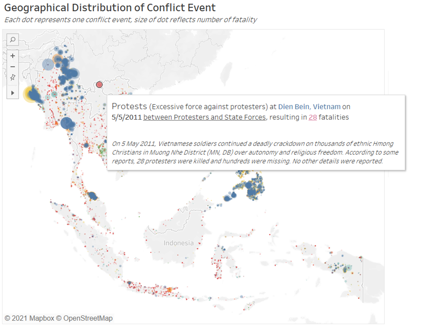 One interesting observation about the protests: for Vietnam, Indonesia, and Malaysia, many of the red dots (protest events) can be found along the coastal area. This is likely due to the fact that civilizations are more likely to start from areas with water sources or coastal areas, and these areas are today more likely to be areas with economic and social weights (e.g. special economic zones, administrative capital, seat of government, or heritage city)