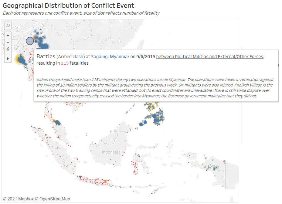 | 4 | Confusing Repeated Color | Both the geospatial map and the time series viz uses the same shade of blue, together with the fact that the legend was placed beside the time series viz, at first glance, it appears as if the time series is only plotting changes for Battles events, which are denoted by the same shade of blue on the map. |