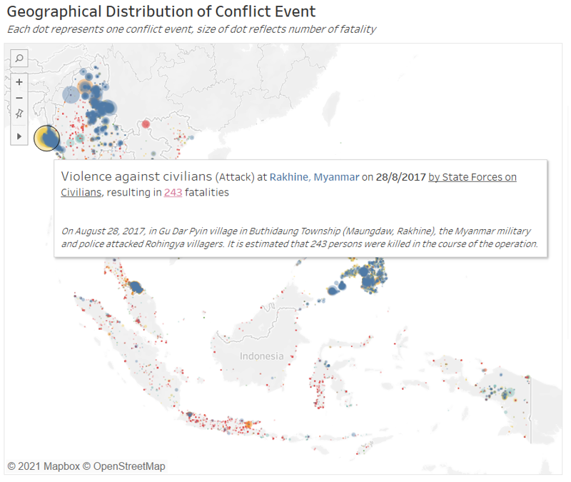 The single most deadly event in the past decade within the region, though, is an infamous Violence against Civilian event (yellow dot), that saw 243 fatalities during Myanmar military and police force’s killing of Rohinya villagers in the Rakhine state on 28 August 2017.